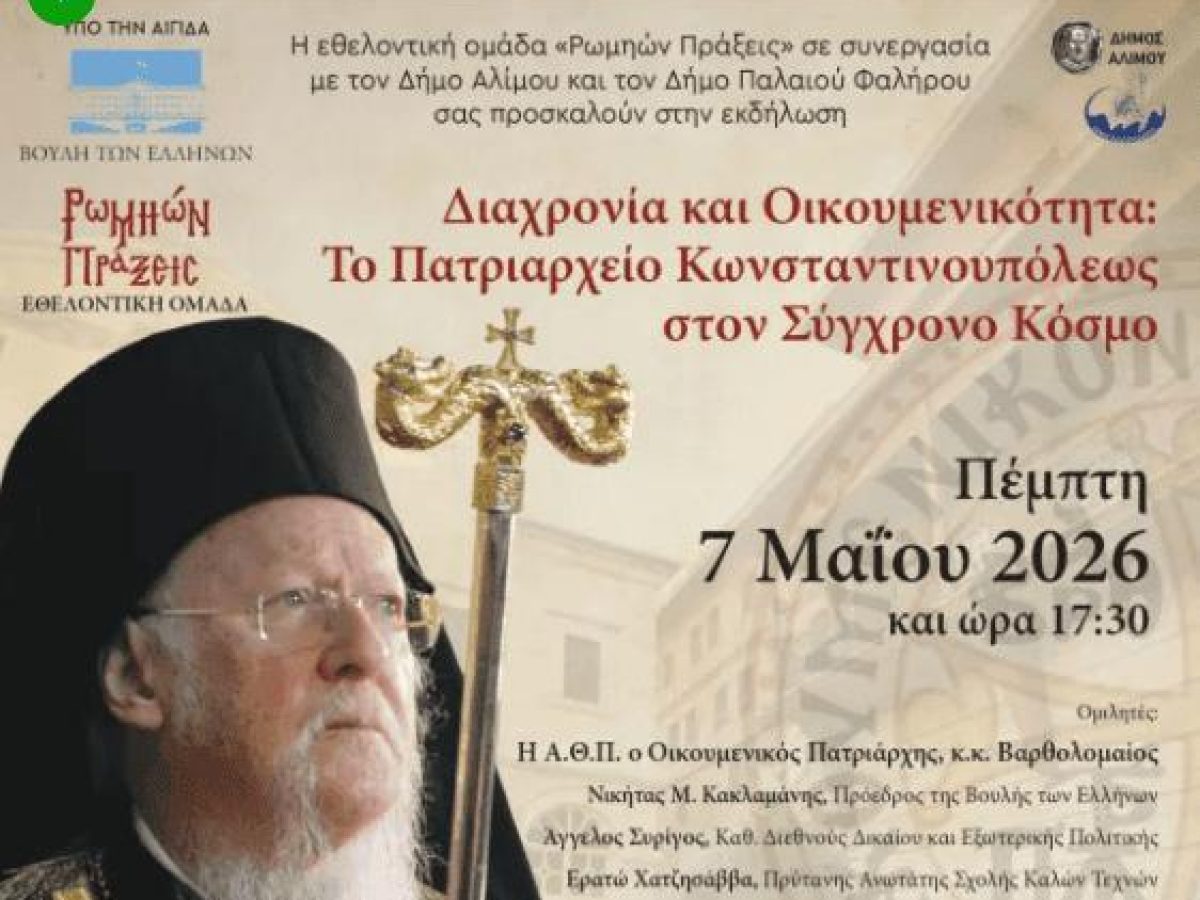 Η εθελοντική ομάδα «Ρωμηών Πράξεις», με την αιγίδα της Βουλής των Ελλήνων και σε συνεργασία με τον Δ. Αλίμου και τον Δ. Παλαιού Φαλήρου διοργανώνει στο Θέατρο «Παλλάς» την εκδήλωση με τίτλο «Διαχρονία και Οικουμενικότητα: Το Πατριαρχείο Κωνσταντινουπόλεως στον Σύγχρονο Κόσμο» την Πέμπτη, 7 Μαΐου 2026 και ώρα 17:30 (έναρξη προσελεύσεως ώρα 16:30 – πέρας προσελεύσεως ώρα 17:15).