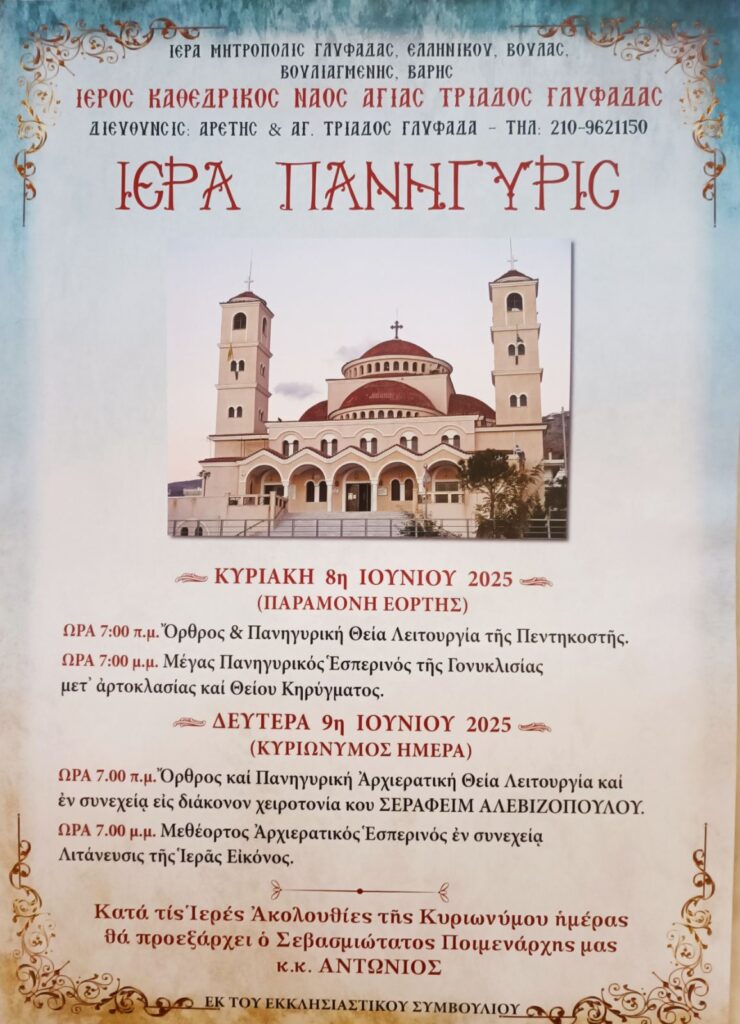 Με κάθε λαμπρότητα θα πανηγυρίσει και φέτος ο Καθεδρικός Ιερός Ναός Αγίας Τριάδος Γλυφάδας κατά το ακόλουθο πρόγραμμα: