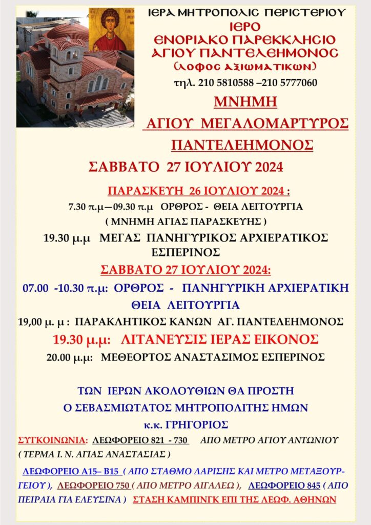 Πανηγυρίζει το ενοριακό παρεκκλήσιο του Αγίου Παντελεήμονος που ανήκει στον Ιερό Ναό Αγίας Αναστασίας της Πατρικίας Λόφου Αξιωματικών.