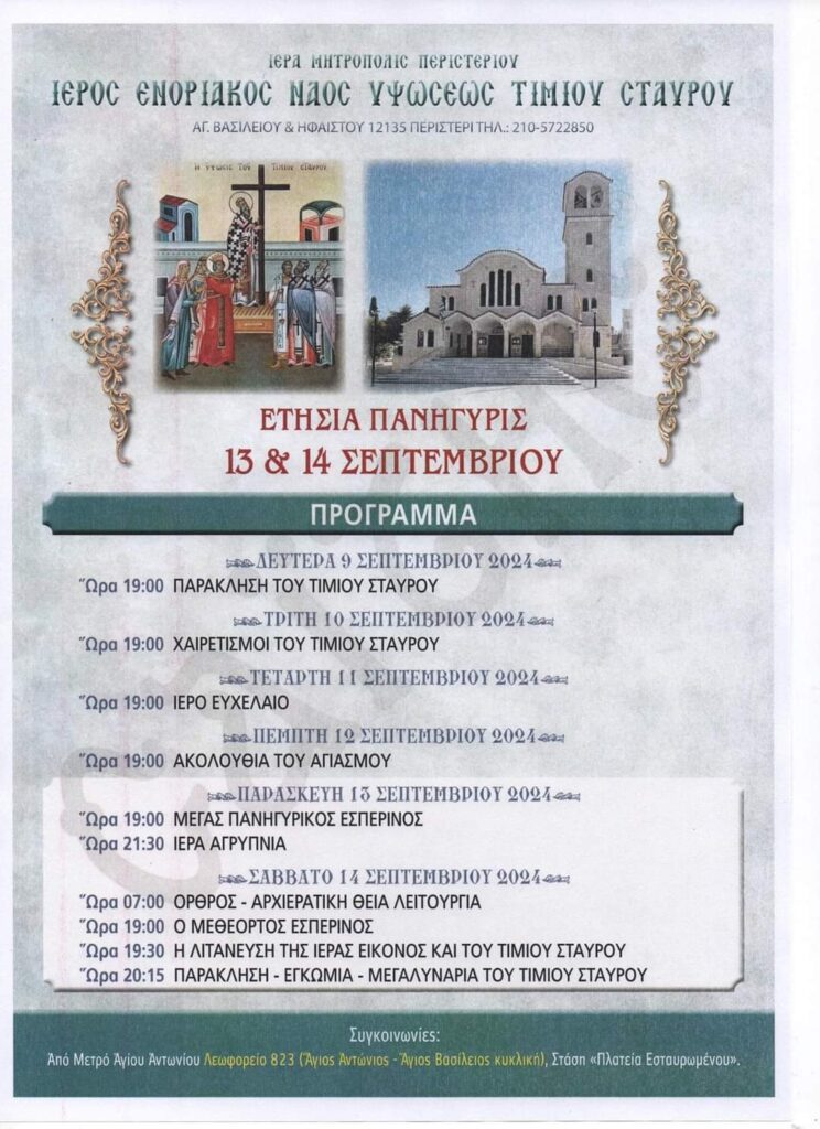 Ο Ιερός Ναός Υψώσεως Τιμίου Σταυρού Περιστερίου πανηγυρίζει την Δεσποτική εορτή της Υψώσεως του Τιμίου Σταυρού κατά το ακόλουθο πρόγραμμα εκδηλώσεων: