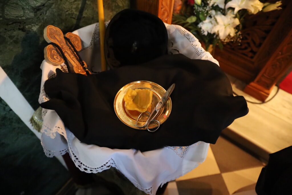 Λαμβάνεις ως αντίδωρο της προσφοράς σου αυτής το ευλογημένο μοναχικό ένδυμα, με ότι αυτό, άγιο και ουράνιο συμβολίζει, ως και το μοναχικό σου όνομα Θεοδόσιος, ένα όνομα για την αιωνιότητα, ένα όνομα άγιο ενός μεγάλου πατρός της Εκκλησίας μας, εκ των θεμελιωτών του κοινοβιακού μοναχισμού, που είναι η ασφαλεστέρα οδός της μοναχικής αφιερώσεως στην Ορθόδοξη Εκκλησία μας, ένα σεπτό όνομα, που επαξίως έφερε και ο αγιασμένος και εν ουρανοίς αναπαυόμενος Γέροντας της Βηθανίας του παλαιφάτου Πατριαρχείου Ιεροσολύμων, ο π. Θεοδόσιος. Λαμβάνεις αυτό το ιερό όνομα λοιπόν και εις έκφρασιν τιμής και σεβασμού προς την αγία Σιωνίτιδα Εκκλησία και προς την σεπτή μορφή του Γέροντος Θεοδοσίου της Βηθανίας. Ας έχουμε την ευχή του.