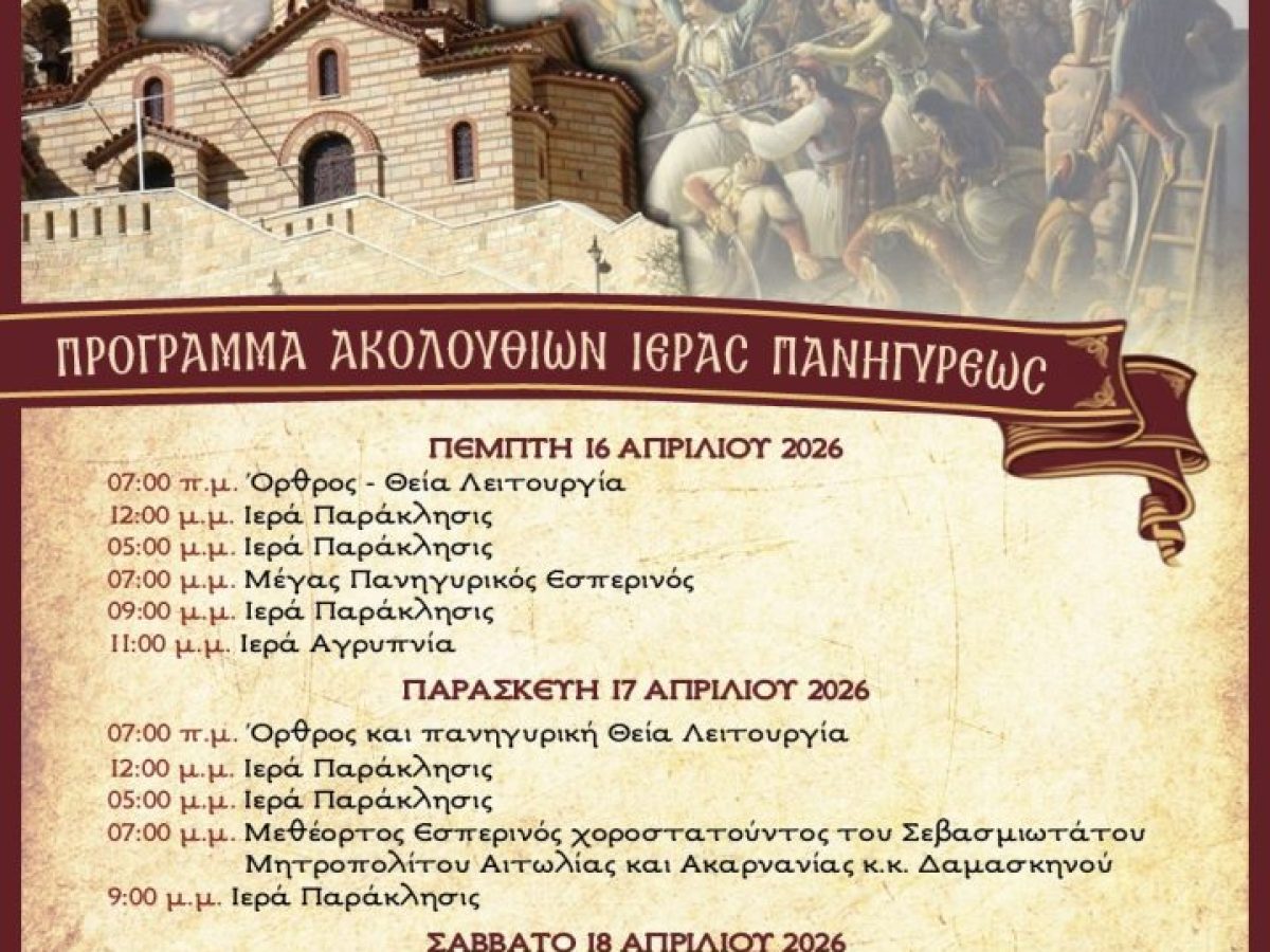 11:00 μ.μ. Ιερά ΑγρυπνίαΠΑΡΑΣΚΕΥΗ 17 ΑΠΡΙΛΙΟΥ 202607:00 π.μ. Όρθρος και πανηγυρική Θεία Λειτουργία