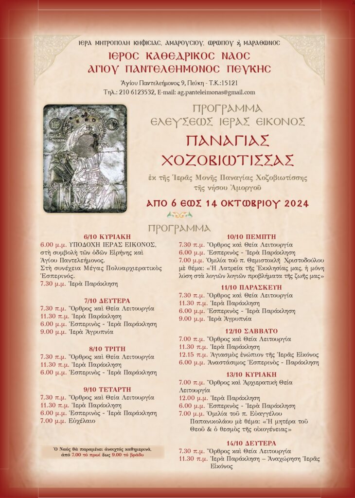 Την Ιερά Εικόνα της Παναγίας Χοζοβιωτίσσης από την Αμοργό, θα υποδεχθεί με κάθε λαμπρότητα ο Καθεδρικός Ιερός Ναός Αγίου Παντελεήμονος Πεύκης την Κυριακή 6 Οκτωβρίου 2024.