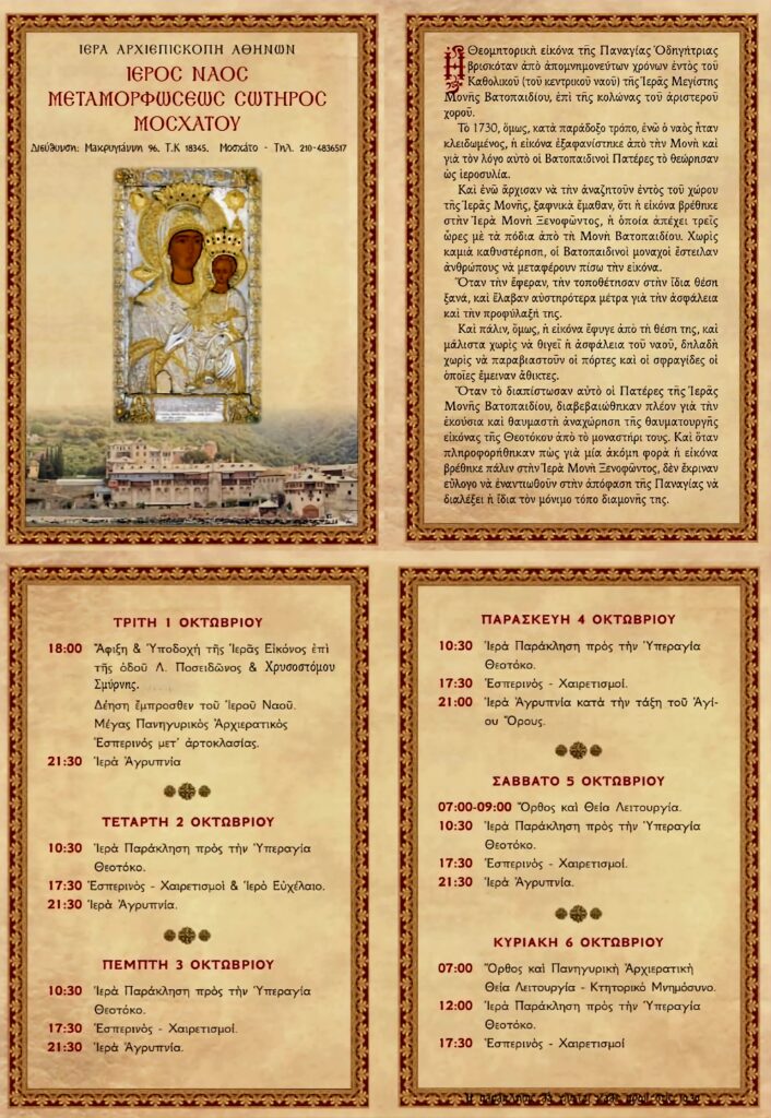 Με κάθε επισημότητα η Αθήνα θα υποδεχθεί την Ιερά και Θαυματουργό Εικόνα της Παναγίας “Οδηγήτριας” από την Ιερά Μονή Ξενοφώντος του Αγίου Όρους στον ενοριακό Ιερό Ναό Μεταμορφώσεως του Σωτήρος Μοσχάτου.